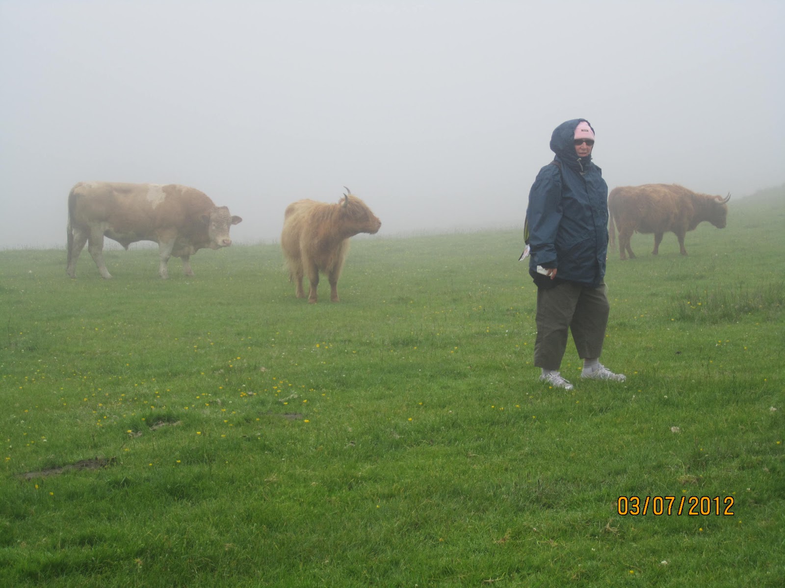 Beki the guide from RSPB had been one of the speakers at last nights event The mist was so thick it was difficult to see more than 50 m which did make birdwatching a little difficult but our group of 12 hardy soul trudged onwards, many equipped with binoculars (about as useful in the mist as the sunroof we had in the Volvo car in England !!). We did see Highland cattle, blackfaced sheep, some seals on beach though a fleeting break in the mist and then amazingly a family of about 5 Choughs ( endangered bird) flying over the cliff edge. Good energetic walk though.